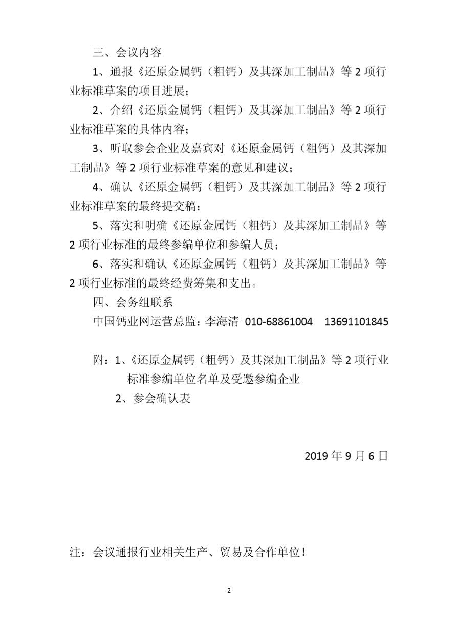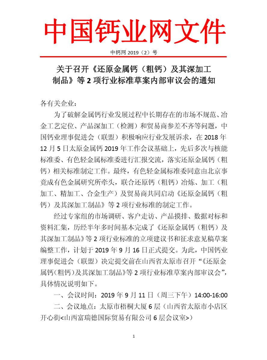 关于召开《还原金属钙(粗钙)及其深加工制品》等2项行业标准草案内部审议的通知