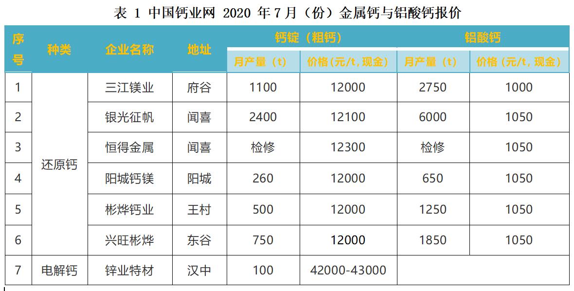 中国钙业网(中国钙业理事促进会<联盟>)坚守在复工复产的钙邦信息前沿,自2020年2月份以来,连续数月为行业企业提供国内外商业变化、海运物流、消费压减、政策趋势,市场应急等多方面的免费咨询,帮助钙邦同仁攻克难关,有效稳定了金属钙行业上下游的产业发展结构,推进市场消费,加快围绕新基建(材料)创新开发潜在市场。本站经过充分调研和考量市场供需,适时衔接冶炼、加工和应用企业,整理出2020 年7月(份)金属钙与铝酸钙的产量及报价(如表1所示),仅供参考。
