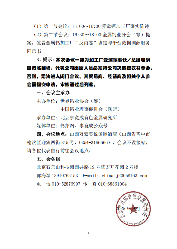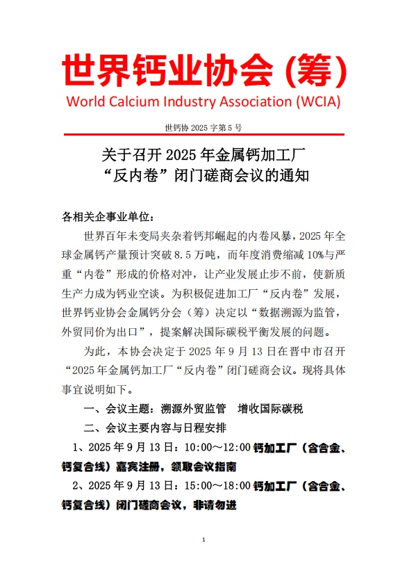 为此,本协会决定于 2025 年 9 月 13 日在晋中市召开“2025 年金属钙加工厂“反内卷”闭门磋商会议。现将具体事宜说明如下。