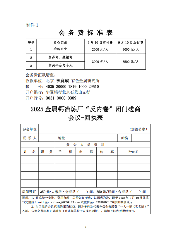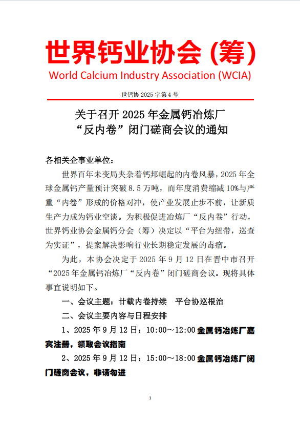 为此,本协会决定于 2025 年 9 月 12 日在晋中市召开“2025 年金属钙冶炼厂“反内卷”闭门磋商会议。现将具体事宜说明如下。