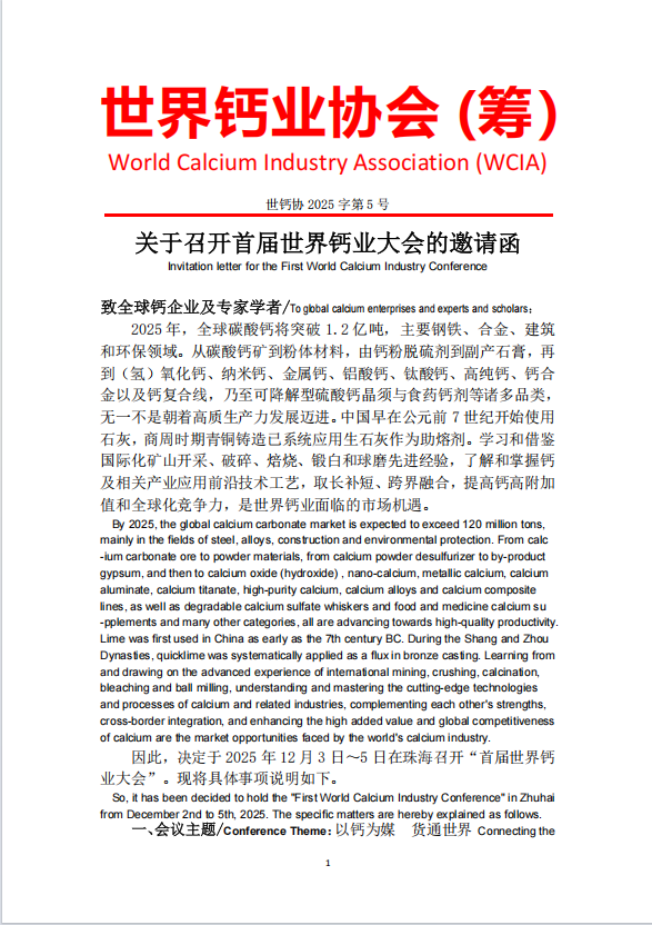 关于召开首届世界钙业大会的邀请函 the First World Calcium Industry Conference