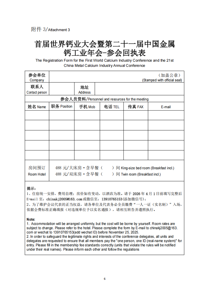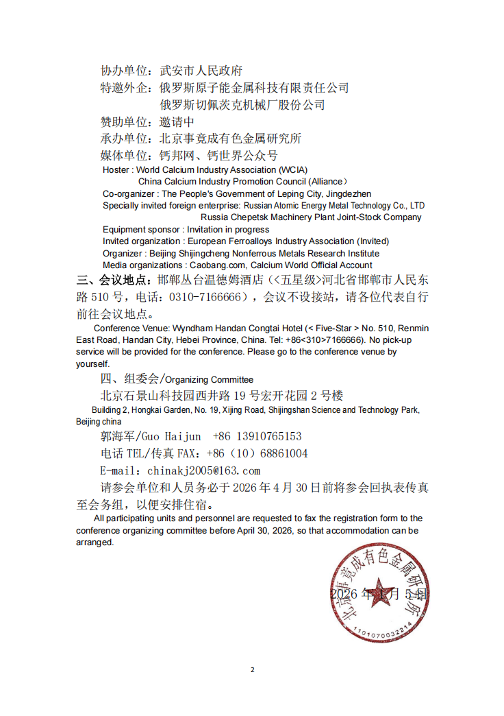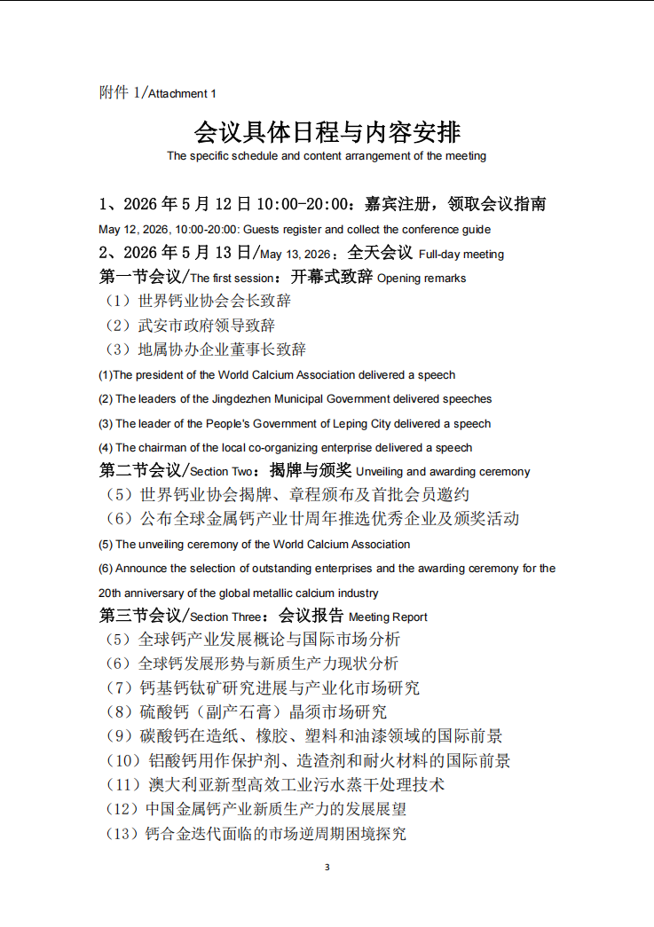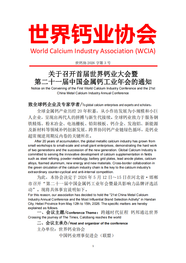 为此,本协会决定于2026年5月12日~15日在河北省·邯郸市召开“第二十一届中国金属钙工业年会暨最具影响力品牌评选活动”。现将具体事宜说明如下。