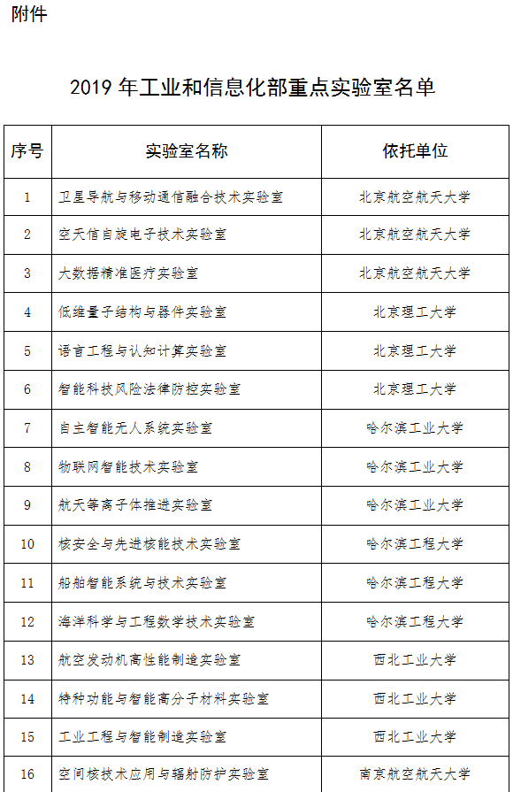 依据《工业和信息化部重点实验室管理暂行办法》(工信部科〔2014〕515号),经评审和公示,现将2019年工业和信息化部重点实验室名单予以公布(名单见附件)。